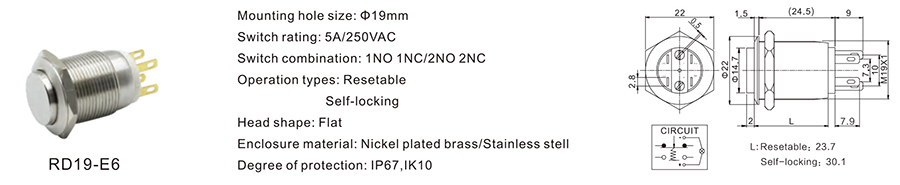 19MM金属开关RD19-D2 金属开关 RD19-D2 250VDC 3A / / ≥100,000 CYCLES 立即申请 下载